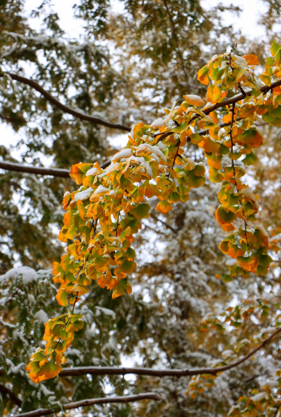 抬头仰望,寒冬的银杏叶与天穹并肩私语;侧身细看,深秋的鎏金枝桠与瑞雪亲密互动;低头一瞧,细密的黄叶手牵手结成一片连绵的毯。半是秋景半是冬,杏黄与雪色之间,大泽山是第三种绝色。